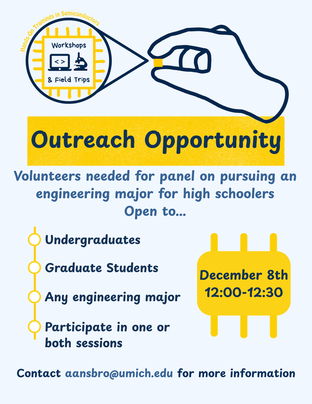 A panel is being held on December 8th at 12:00 -12:30 PM for high schoolers interested in pursuing an engineering major. If you are interested in being a panelist, please send an email to aansbro@umich.edu AND sign up on the website ONLY if you have been told you can be a panelist. The event will be held somewhere on north campus (TBD).